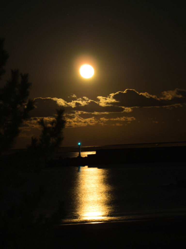 海に面した窓際でパソコンを操作しているので月が出てきたのに気が付いた。